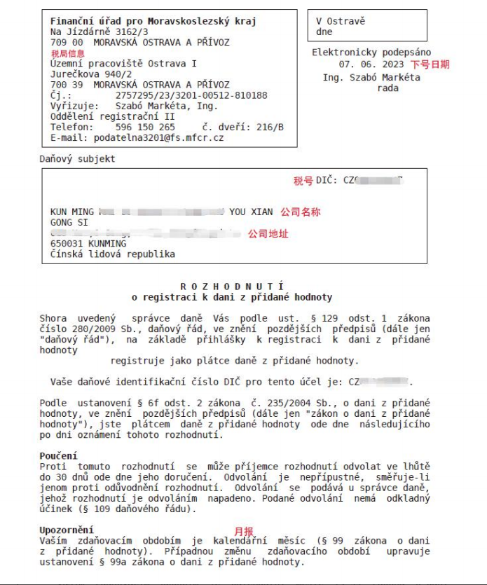 捷克 VAT 税号文件示例: