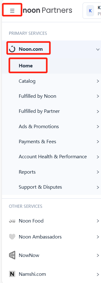 5、点击左上角“三”标记的菜单栏>点击【Noon.com】>点击【Home】