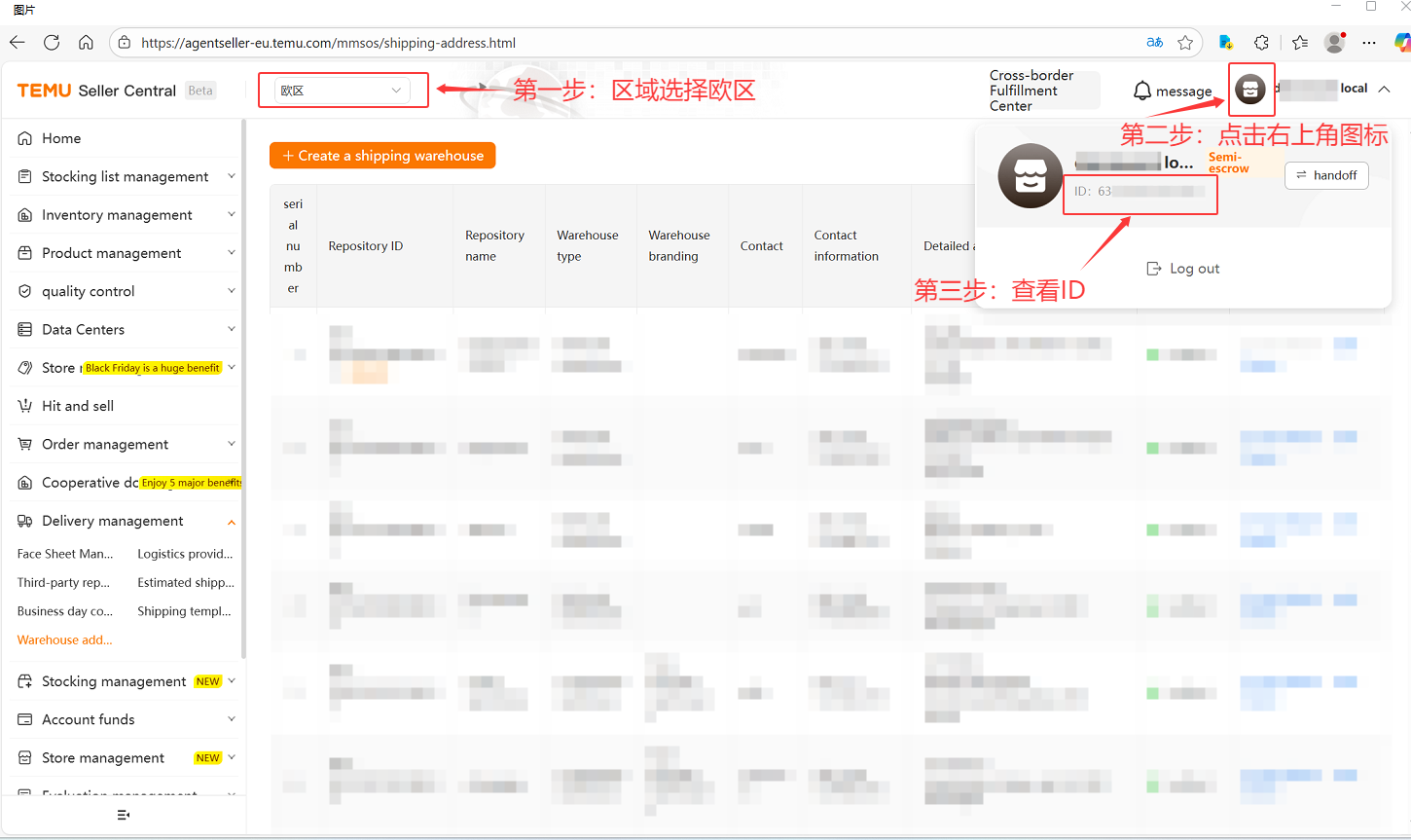 5、继续点击左边菜单栏的【Delivery Management】>【Warehouse Address Management】,截图⑤