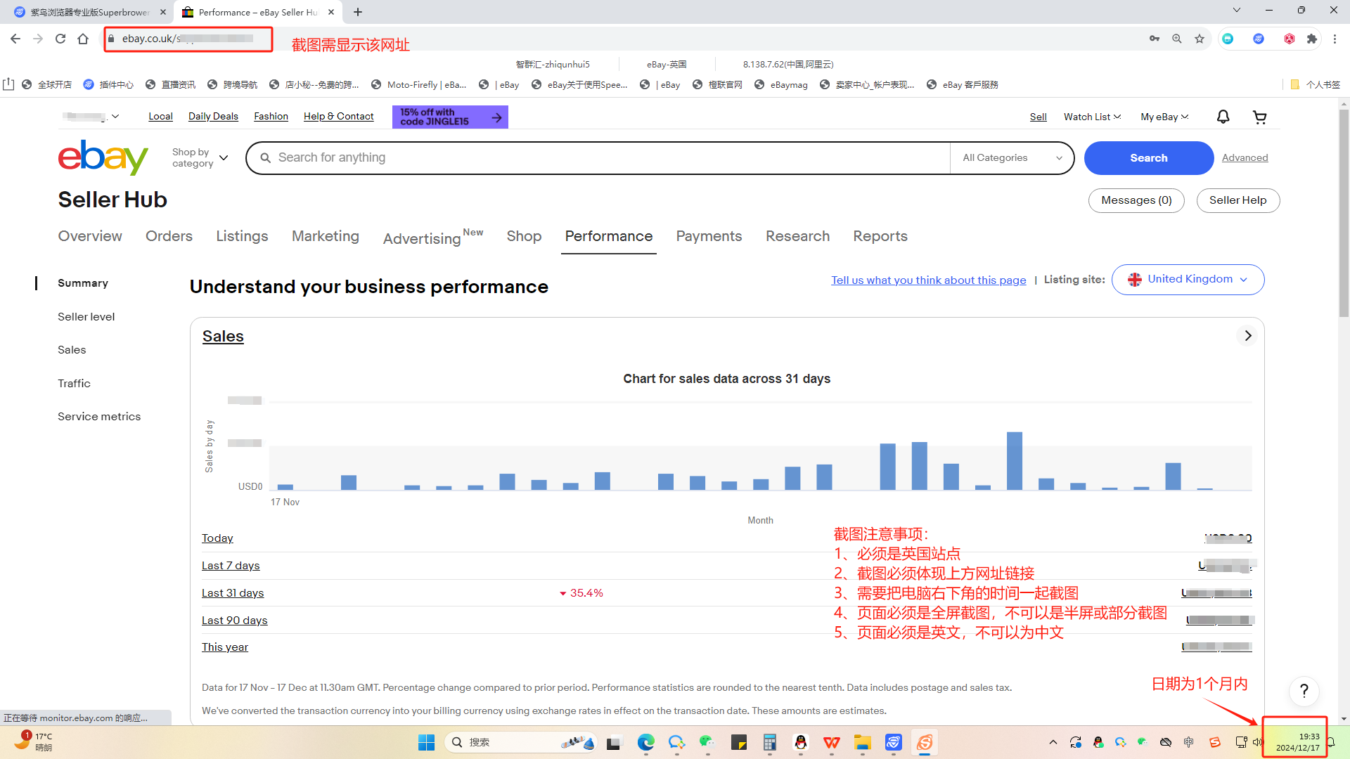 1、截图界面需显示店铺上方的网址链接,以及下方电脑任务栏和电脑日期时间(截图日期需为 1 个月内的)。