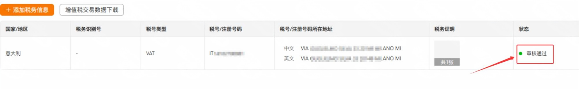 1、登陆卖家中心 ,选择【欧区】>【税务信息】>【添加税务信息】2、国家/地区选择【意大利】3、填写【意大利VAT税号】>【VAT所在地址】>上传【VAT证书截图】4、VIES网站的查询指引请点击:欧盟VAT税号查验。5、添加成功, 税号会显示“审核中”,平台审核时效大概2~5个工作日6、显示“审核通过”代表税号验证通过, 显示“被拒绝”代表税号绑定被拒,请先联系平台客服了解被拒原因之后再针对性处理