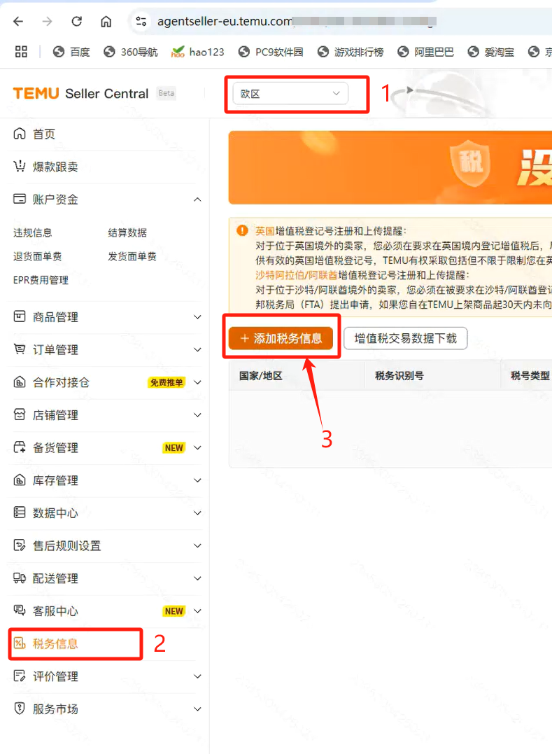 1、登陆卖家中心 ,选择【欧区】>【税务信息】>【添加税务信息】
