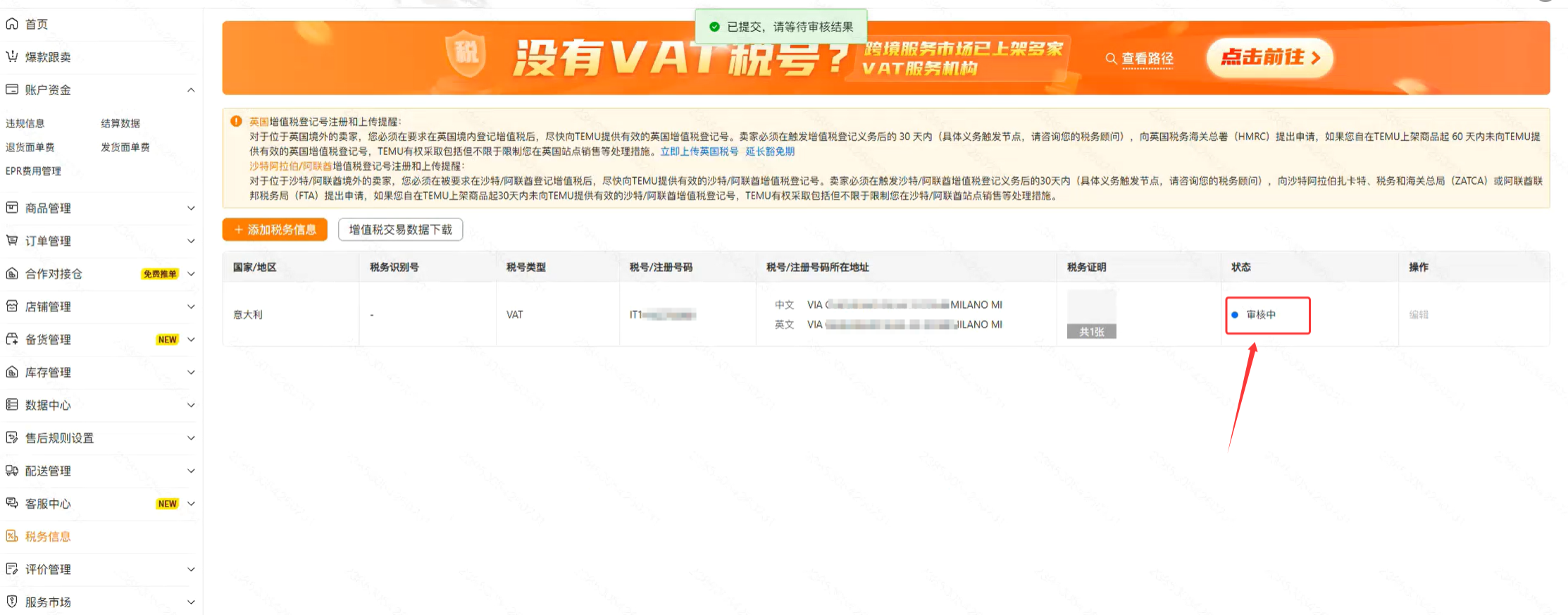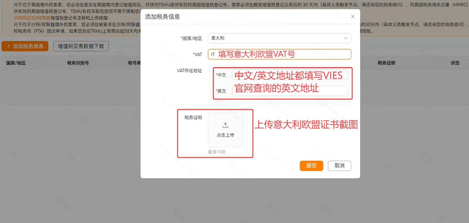 3、填写【意大利VAT税号】>【VAT所在地址】>上传【VAT证书截图】