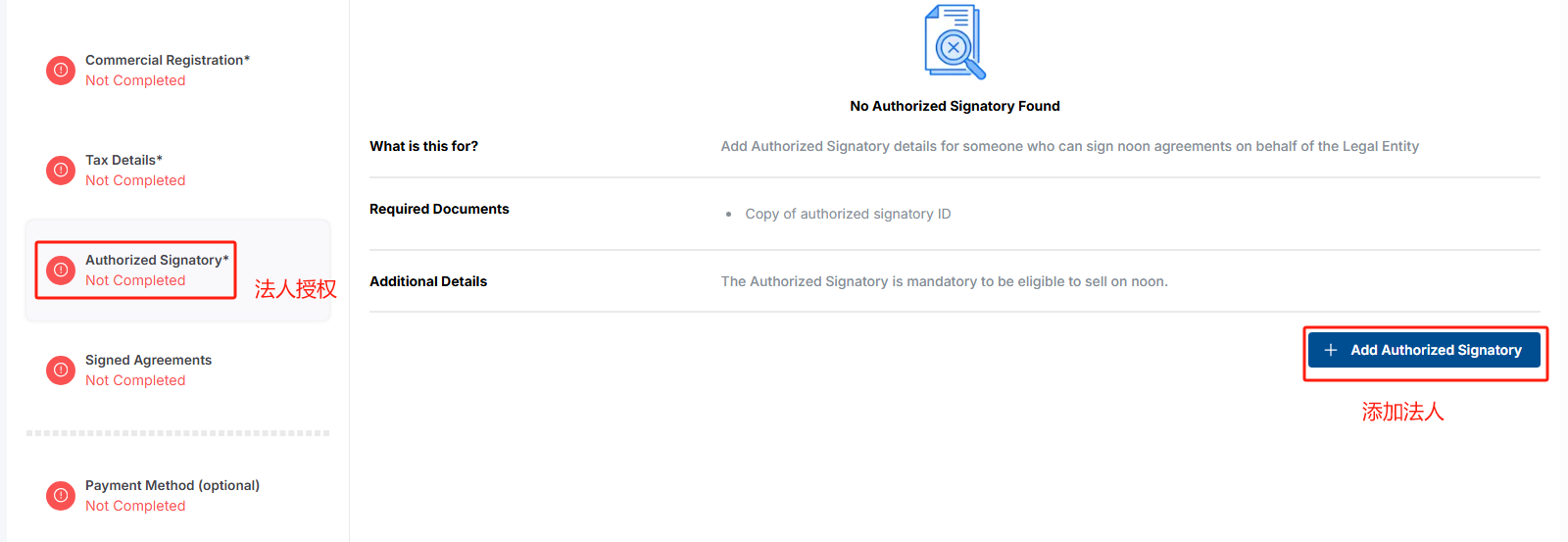 7、点击【Authorized Signatory*】>【Add Authorized signatory】>上传填写法人相关信息并点击【Create Authorized Signatory】保存法人信息