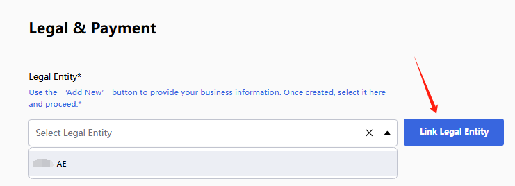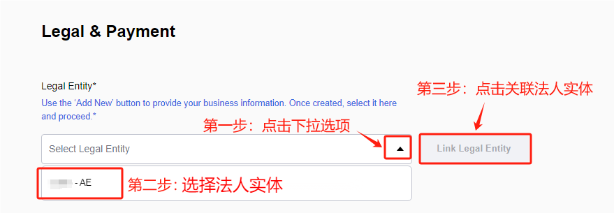 4、找到【Legal & Payment】>【Legal Entity*】>点击【下拉选项】>点击【您需要关联法人】>点击关联【法人实体】>点击已经关联成功的法人实体