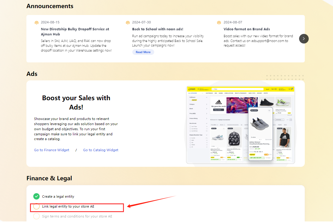 (1)找到【Finance & Legal】,然后点击【Link legal entity to your store AE】