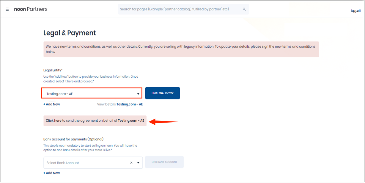 (3)成功关联法人实体后,需要点击【单击此处代表】>【法人实体名称发送协议】查看并接受中午销售的条款和条件(T&Cs)