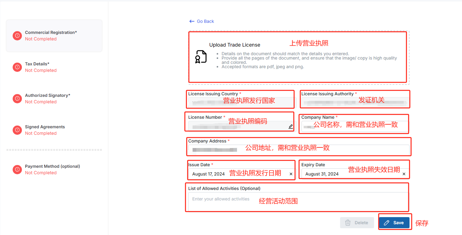 5、点击【Commercial Registration*】>【Details】>填写公司信息并上传营业执照>点击【save】保存为草稿