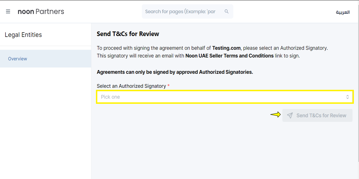 (4)从下拉列表中选择【授权签名人姓名】>【Send T&C for Review】提交平台审批