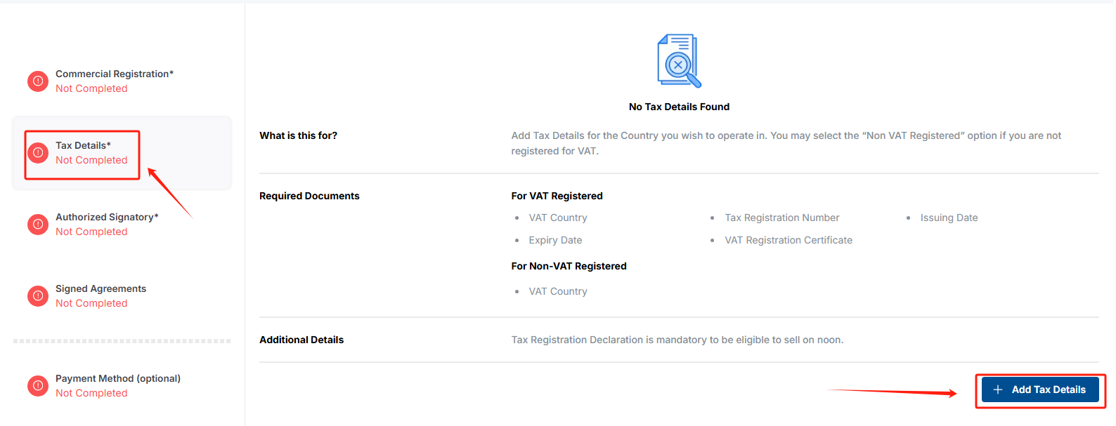6、点击【Tax Details】>【Add Tax Details】>Tax Country选择【纳税国】>VAT Type 选择【VAT Registered】>点击【Next Step 】>上传VAT证书>填写VAT税号>填写下证日期>点击添加【税务详细信息】保存为草稿