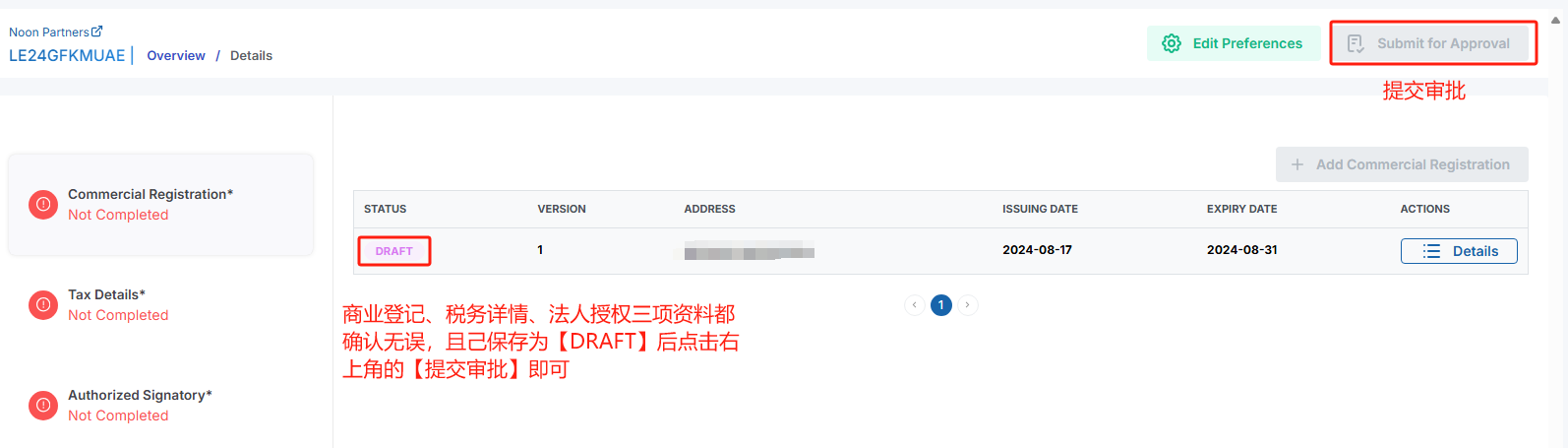 8、商业登记、税务详情、法人授权三项资料都确认无误,且己保存为【DRAFT】后点击右上角的【Submit for Approval】提交到平台等待审批即可,审批结果平台会通过邮件通知