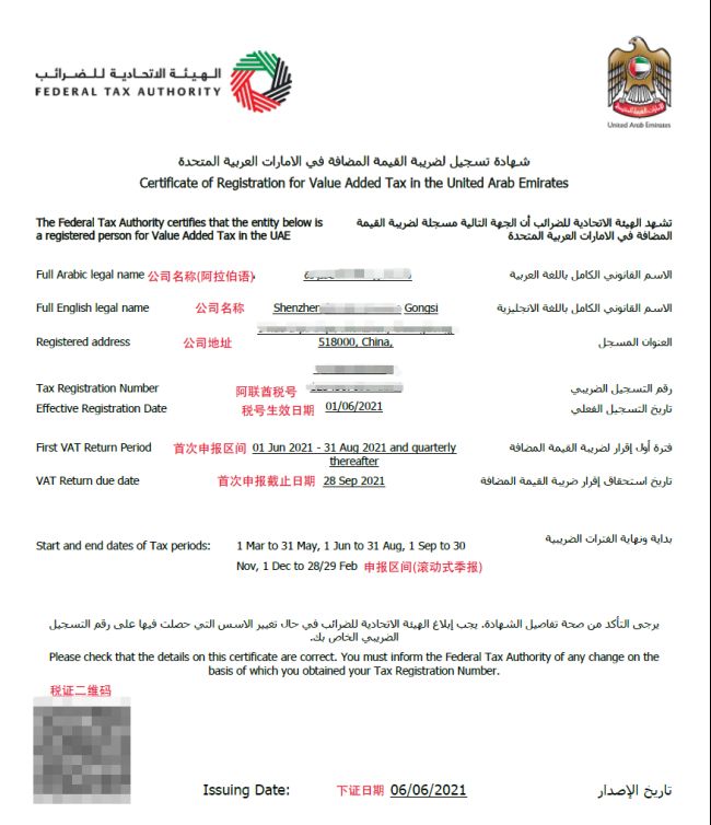 阿联酋管理局会为税务登记的人颁发的唯一税务登记号码TRN(Tax Registration Number),格式为15位的阿拉伯数字,例123456789012345。