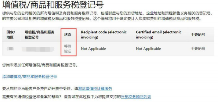 5、添加成功,税号会显示“等待验证”,平台审核时效大概1-3个工作日