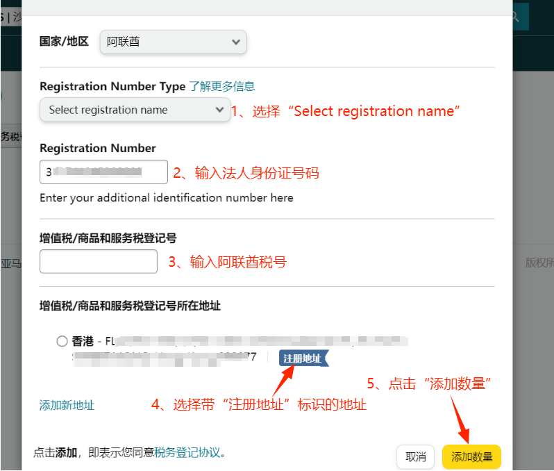 4、填写【税号】、【法人身份证件号码】,地址选择带有“注册地址”,点击勾选提交